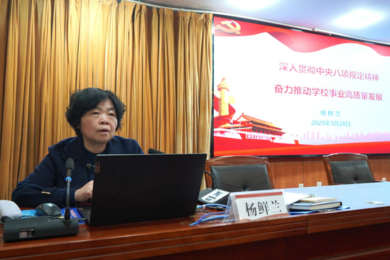 杨鲜兰要求,全校上下要加强组织领导,确保学习教育与学校重点工作紧密结合,推动学校教育教学、科研创新、人才培养等工作取得新成效。要通过宣传教育营造良好氛围,教育引导广大党员干部强化支点意识、抬升发展标杆,持续提振干事创业的精气神,确保中央八项规定精神在学校落地生根,为学校高质量发展提供坚强保障。(图片 影像工作室 新闻中心编辑 夏锐)
