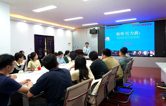 朱宗宏作《聆听引力波-张衡天文台构想》主题学术报告。他系统阐述国际国内引力波观测历程与发展脉络,展现引力波探测的广阔前景,并分享个人在该领域的研究经验。交流会上,物理与机电工程学院汇报了物理学国家一流本科专业建设成果、科学与技术教育硕士点培育进展,以及本科生天文特色培养规划。朱宗宏充分肯定学院在天文特色物理学科建设方面的成效,并就学科发展与科教融合提出宝贵建议。