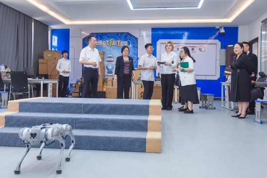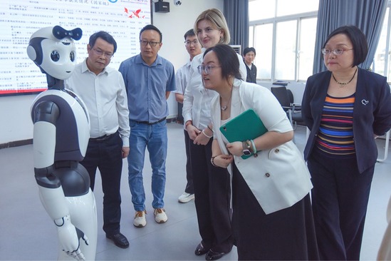 访问期间,克维茨亚尼重点考察基地与教育数字化发展中心联动的应用场景。在学校教育数字化发展中心,她对AI教学测评、智慧实验室管理平台、大模型应用及数字人展示等内容仔细询问交流,表现出浓厚兴趣。“你好,我们能握手吗?”在AI人形机器人前,克维茨亚尼用简单汉语与其对话,并称赞:“科技让语言文化传播变得更生动、更有亲和力。”