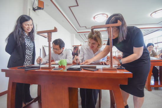郑军介绍,书法体验是基地面向国际友人的经典项目,旨在通过笔墨让外宾感受汉字的形意之美。克维茨亚尼还跟随非遗传承人体验剪纸艺术,欣赏了汉服表演和古筝演奏。
