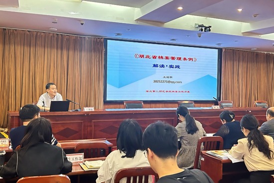 王艳明以“《湖北省档案管理条例》解读・实践”为题,从条例的出台背景、体例结构、必要性与意义、主要内容与特点、实施与转化的策略和路径等多角度进行详细解读,既有法规条文讲解,又有典型案例分析,内容丰富、实践性强,为提升参会人员依法管档治档的履职水平奠定理论基础。