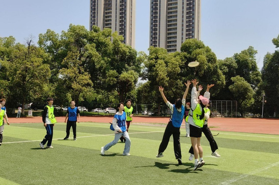 比赛现场,飞盘高速旋转,鼓舞声呐喊声此起彼伏。防守方与进攻方时而奔跑、时而跳跃,以各种方式接盘,全力做到“盘不落地”,充分展现出我校学子激情洋溢的青春风采。