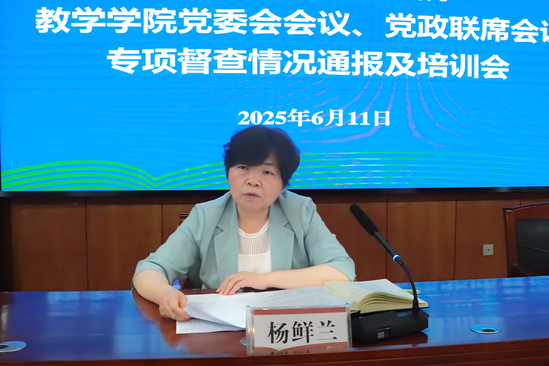 本网讯(通讯员 柯常春)6月11日下午,教学学院党委会会议、党政联席会议专项督查情况通报及培训会在行政楼五号会议室召开。校党委书记杨鲜兰出席,党委副书记胡兴主持会议。