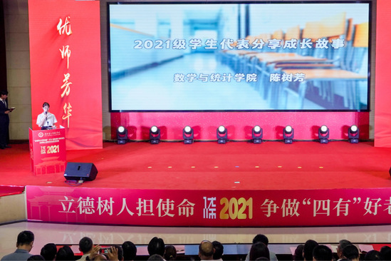 2021年以优秀乡村教师代表身份,参加学校“优师计划”开班仪式的丹江口市三官殿中心小学副校长蔡明镜,再次受邀来校,讲述了自己向下扎根的教学成长经历。教育科学学院班主任刘晶晶作为教师代表,分享了学院“思想铸魂、专业储能、实践赋能”的教培理念。即将赴长阳县一中任教的数学与统计学院毕业生陈树芳作为优师毕业生代表发言。
