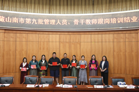 本网讯(通讯员 宋玲玲)6月25日上午,学校在行政楼一号会议室举行西藏山南市第九批管理人员、骨干教师跟岗培训项目结业典礼。副校长张红梅出席,光谷第四初级中学、光谷第十二小学、武汉东湖新技术开发区流芳幼儿园等3所基地校负责人,以及西藏山南市第九批跟岗学员参加典礼。典礼由教师教育学院院长王勇主持。