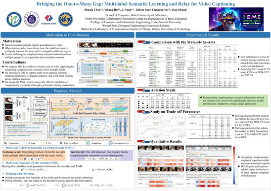 该论文题为《弥合一对多差异:基于多标签语义学习与中继的视频描述生成算法》“Bridging the One-to- Many Gap: Multi-label Semantic Learning and Relay for Video Captioning”,湖北第二师范学院是第一署名单位,由22级电子信息硕士研究生(湖北第二师范学院-湖北师范大学联合培养)胡一康完成,我校计算机与人工智能学院杨莉教授、余良俊教授、陈淑琴博士及武汉理工大学钟忺教授联合指导。