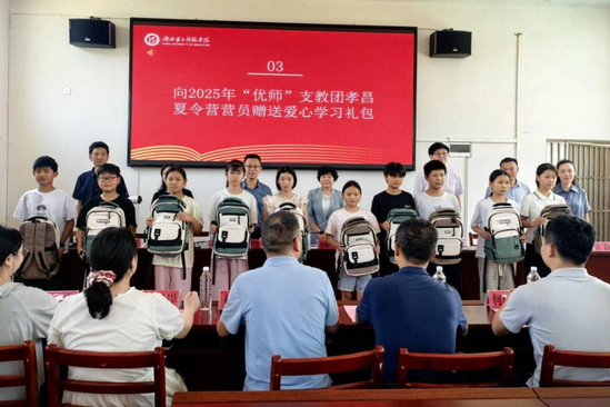 在陡山乡城南中学,杨鲜兰一行看望我校“优师”支教团队全体师生,向“优师”支教团孝昌夏令营营员赠送爱心礼包,向城南中学授牌“湖北第二师范学院科普教育基地”并捐赠科普教育物资。座谈会上,杨鲜兰对地方给予我校志愿服务队的大力支持表示感谢,勉励支教志愿者发挥师范专业特长,创新融合科普教学方法,陪伴地方孩子们过一个安全充实的假期。她寄语志愿者们,要志存高远、坚守教育初心,锤炼教书育人真本领,涵养教育报国硬品格。