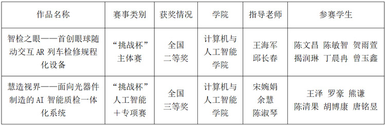 学校高度重视“挑战杯”系列赛事。经竞赛宣传、院级初赛、校级复赛、项目打磨、专家评审、省级复赛等多轮严格筛选,计算机与人工智能学院《慧造视界——面向光器件制造的AI智能质检一体化系统》项目成功入选“人工智能+”专项赛,《智检之眼——首创眼球随动交互AR列车检修规程化设备》项目则跻身“挑战杯”主体赛终审决赛。