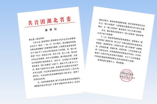 本网讯(通讯员 池家飞 金鑫)近日,共青团湖北省委公布2025年湖北省“七彩假期”社会实践通报表扬名单,我校11支团队成功入选,获表扬团队数量位居全省高校首位,学校同步收到团省委感谢信。