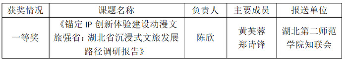 我校知联会获奖课题《锚定IP创新体验建设动漫文旅强省:湖北省沉浸式文旅发展路径调研报告》聚焦湖北沉浸式文旅发展关键命题,紧扣“动漫文旅强省”建设目标,深入探究IP创新体验与文旅产业融合的有效路径,为我省打造世界旅游目的地、推动文旅产业高质量发展提供了富有针对性的实践参考,充分彰显了我校教师服务地方经济社会发展的责任担当与学术实力。