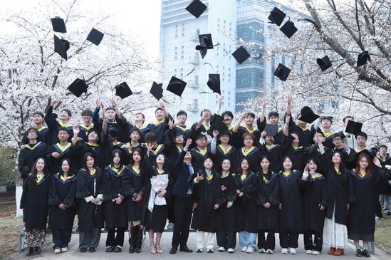 拍摄现场,身着学士服的毕业生们在花海中合影留念。不少学生表示,这场“樱花+毕业照”的特别安排,为大学生活留下了珍贵而温暖的纪念。