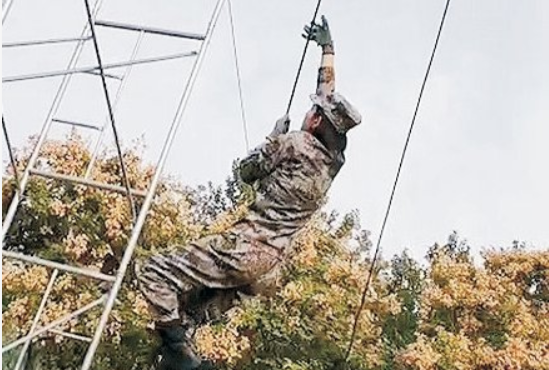 转为作战人员后,詹敏的训练一下子从每月跑3公里转化为每天跑5公里,“这巨大的反差让我感到很痛苦。”攀登、滑降、400米障碍、格斗……特战人员全方位的训练给詹敏带来了完全不能适应的疼痛,“疼过之后就好了,慢慢来。”她时常这样鼓励自己。对侦察连的满腔热血、对崭新军旅生活的期待给了她支撑下去的勇气。“连队中的士兵们都充满血性,身边战友的脸也由白净转化成清一色的黝黑!”