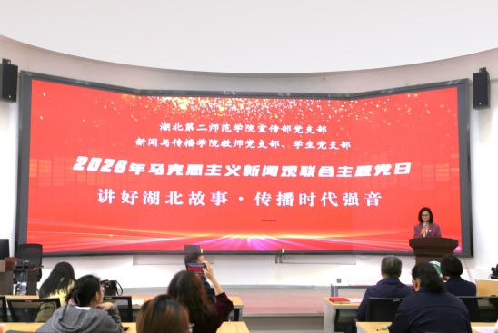 本网讯(通讯员 鄢柠宁)4月16日下午,宣传部党支部、新闻与传播学院教师党支部和学生党支部联合举行“讲好湖北故事,传播时代强音”——2026年马克思主义新闻观联合主题党日活动。校党委常委周忠到会指导,并为2025年湖北“新时代网络文明公益广告”征集活动获奖学生颁发证书。